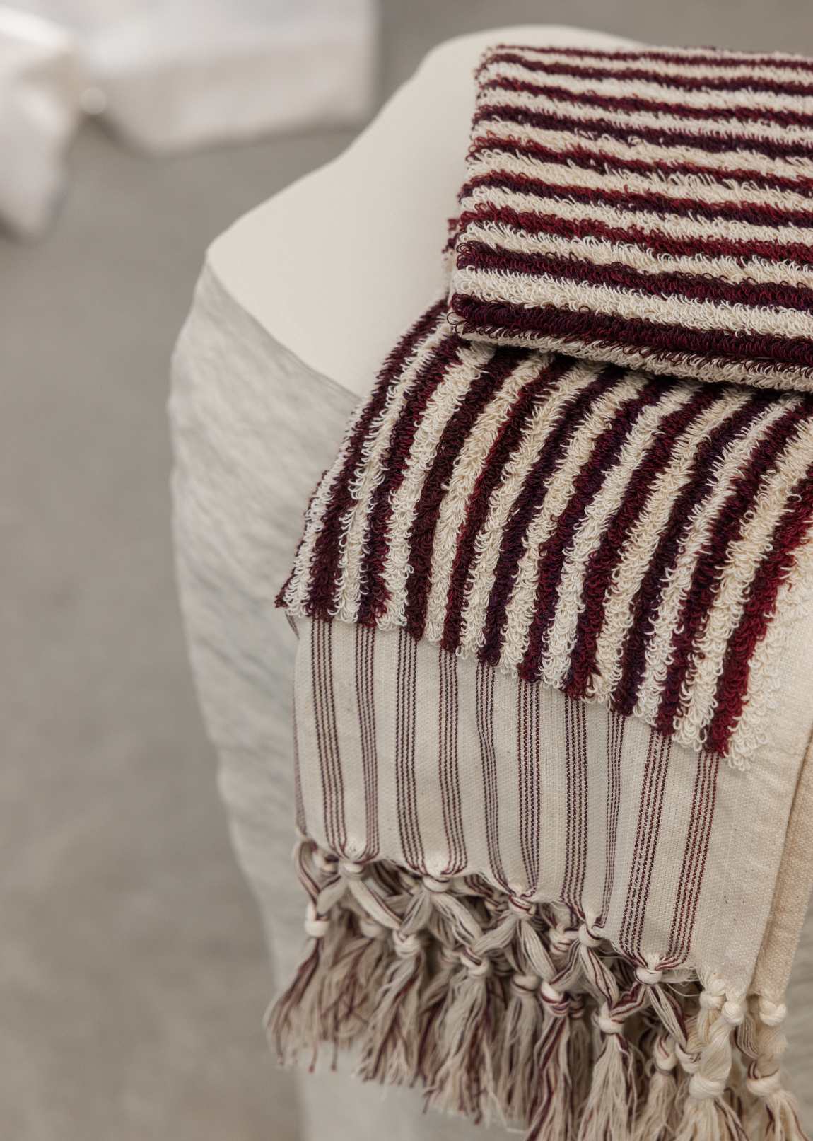 The Burgundy Stripe Hand Towel is a timeless stripe crafted with a mix of three rich burgundy threads and neutral ecru cotton. Tied with traditional Turkish tassels the densely woven, silky soft, organic cotton fibres feel blissfully indulgent and will complement any design aesthetic in the home.